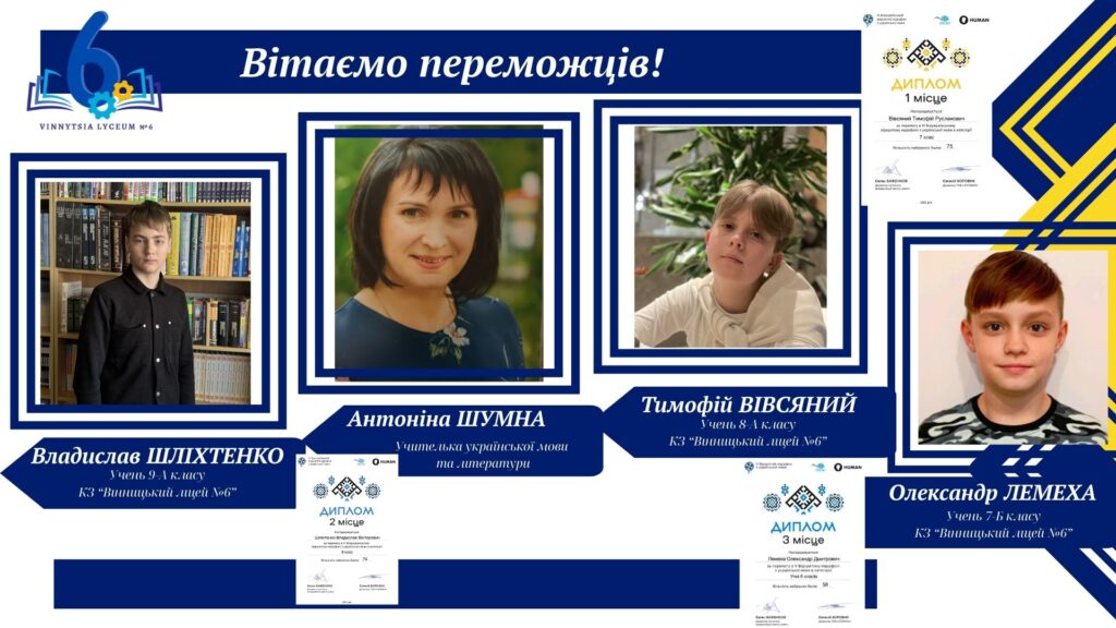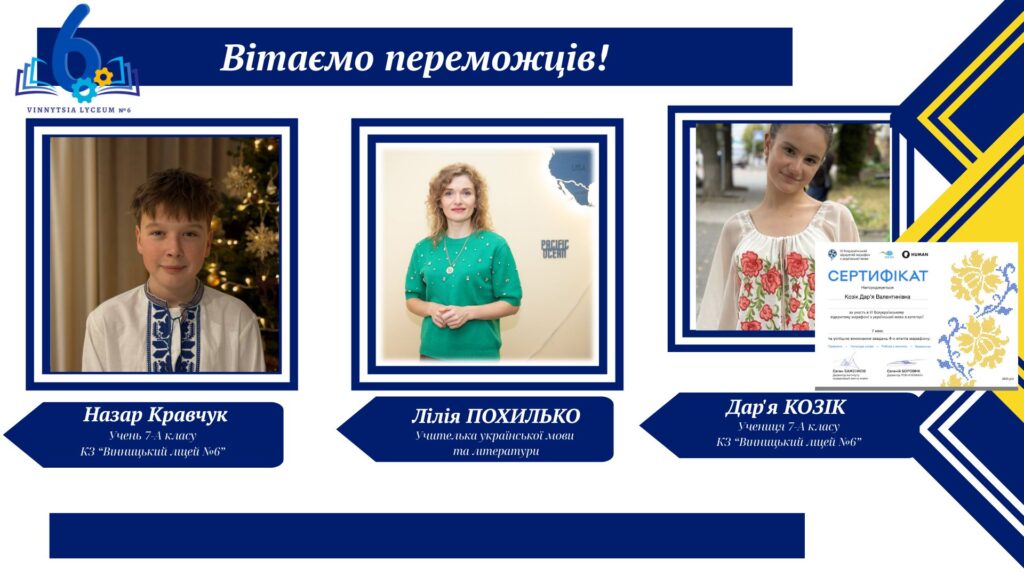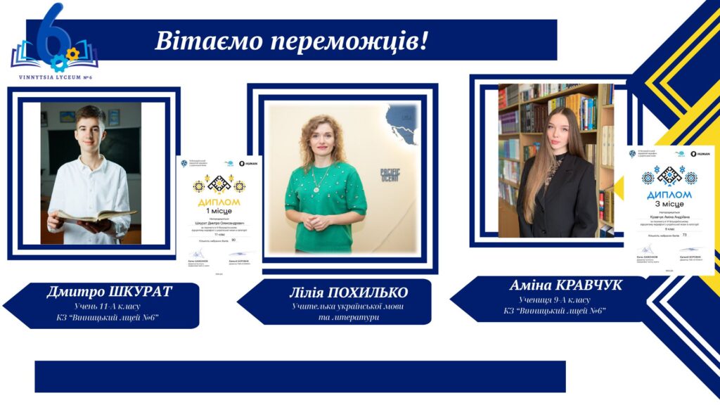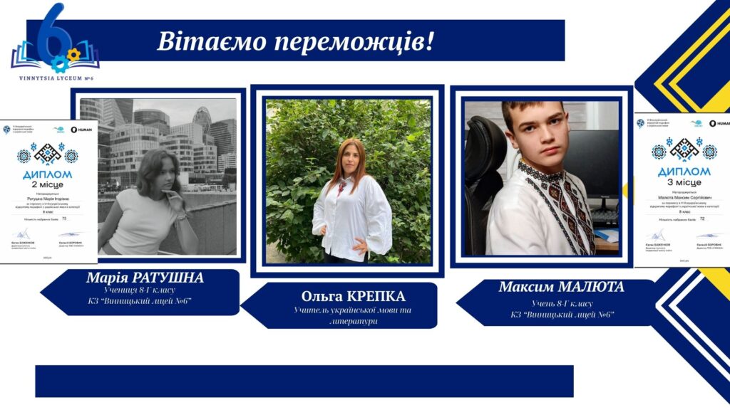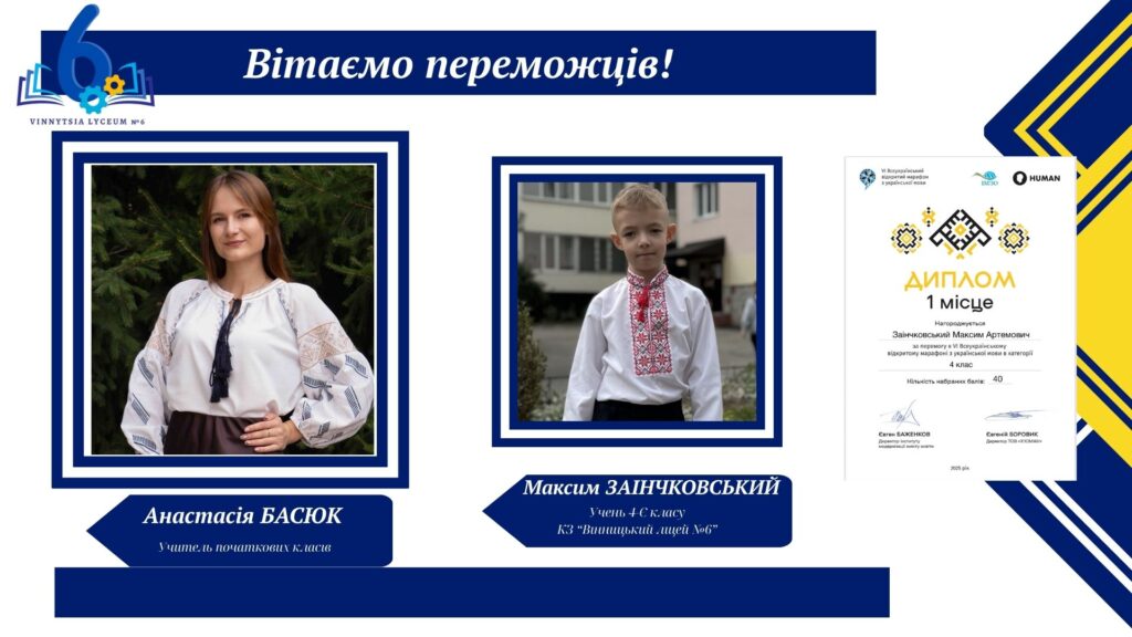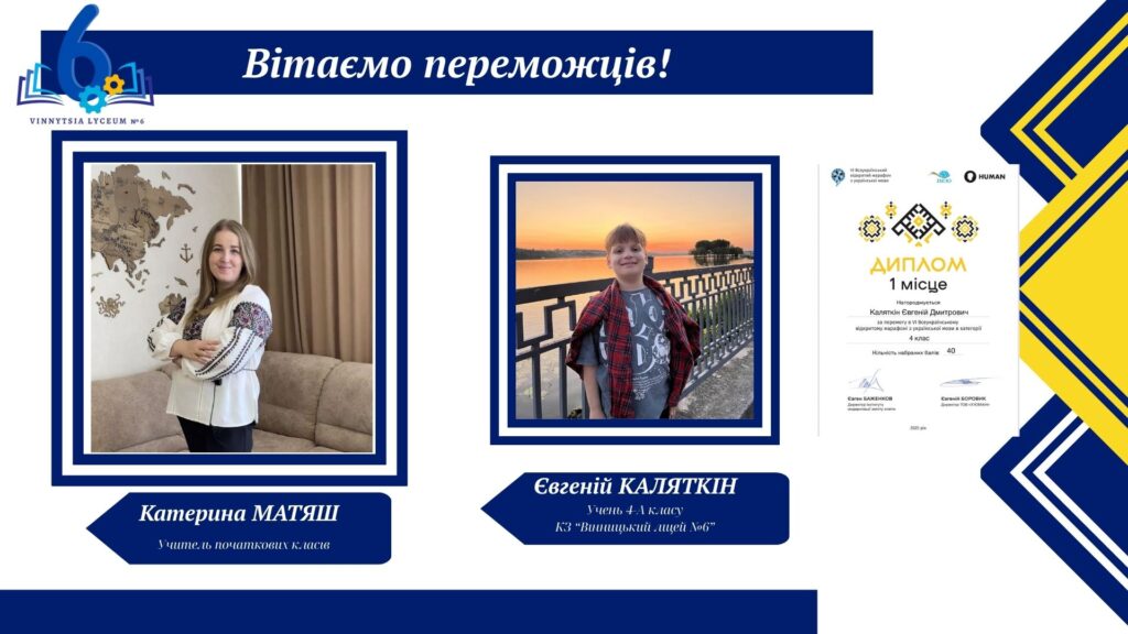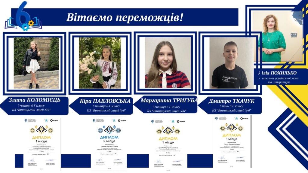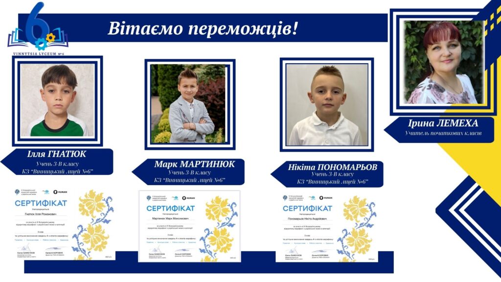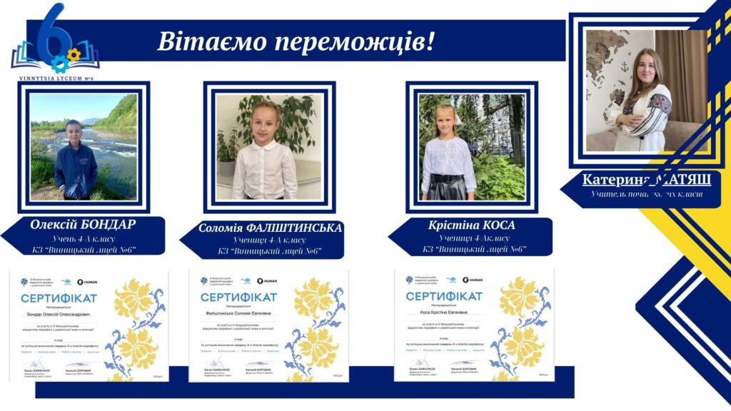 Вітаємо учнів КЗ «Вінницький ліцей №6» із хорошим результатами у VІ Відкритому марафоні з української мови! Цьогоріч Марафон став справді глобальним: понад 16 тисяч учасників зі 191 країни світу випробовували свої знання на платформі «HUMAN».