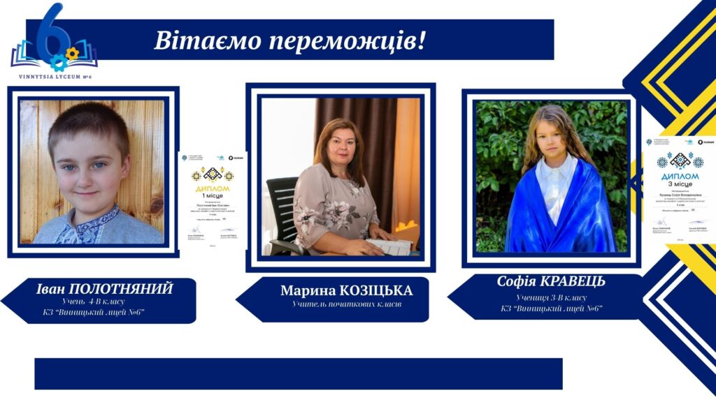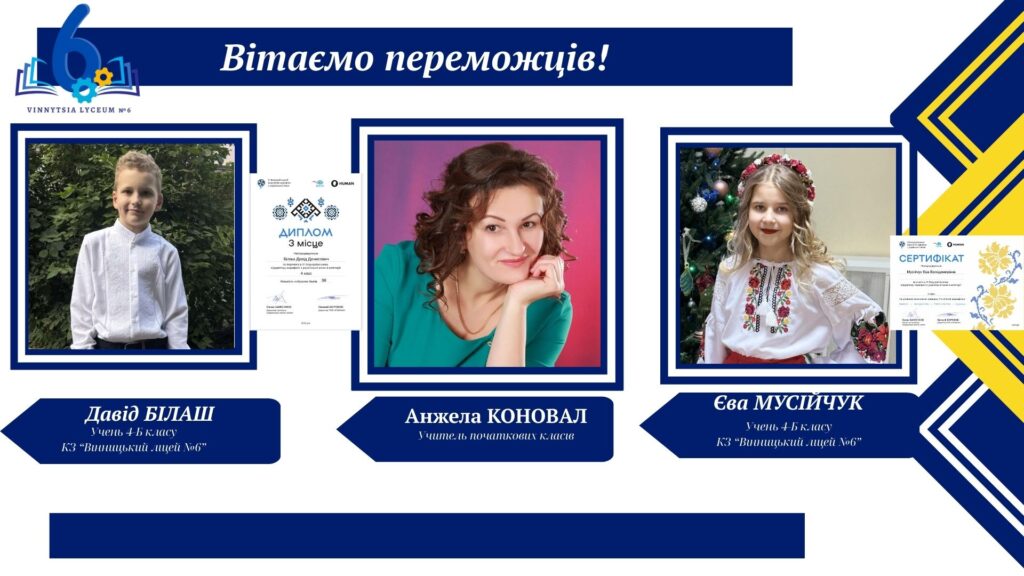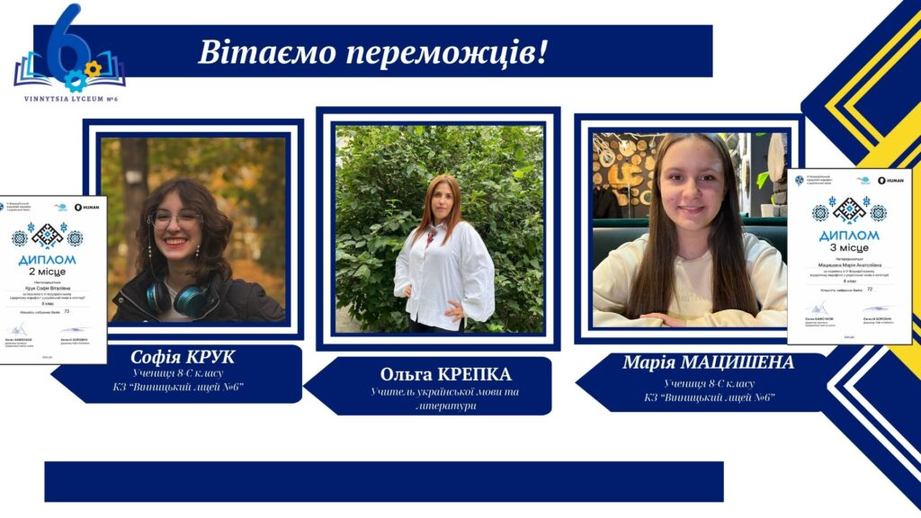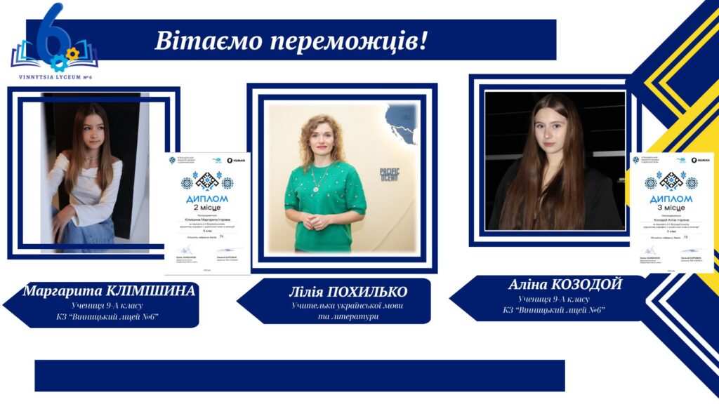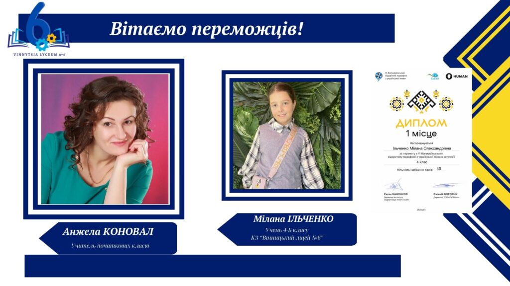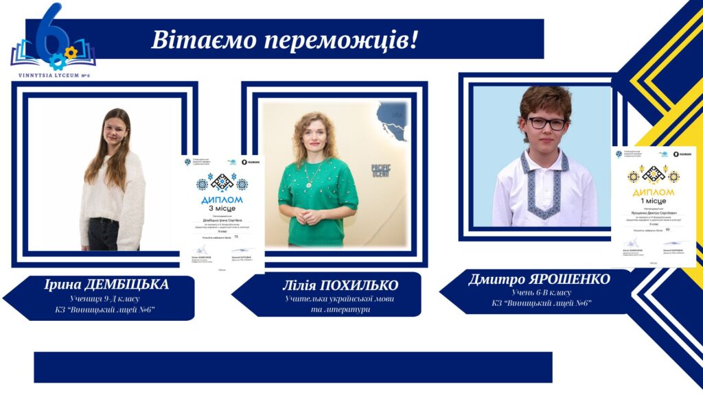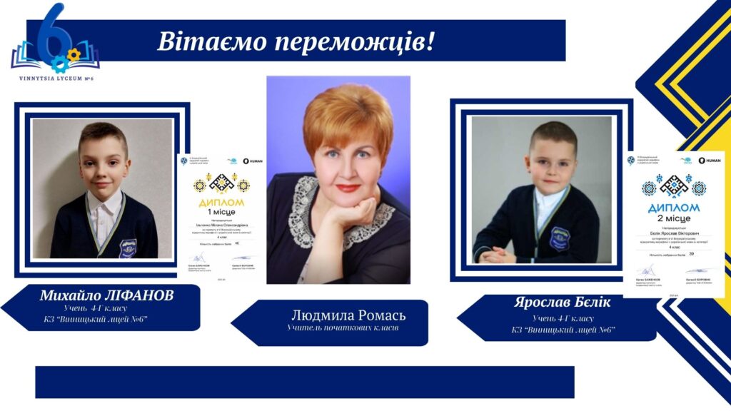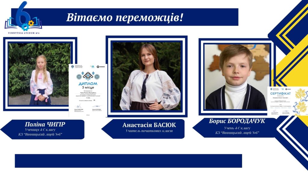 Вітаємо учнів КЗ «Вінницький ліцей №6» із хорошим результатами у VІ Відкритому марафоні з української мови! Цьогоріч Марафон став справді глобальним: понад 16 тисяч учасників зі 191 країни світу випробовували свої знання на платформі «HUMAN».