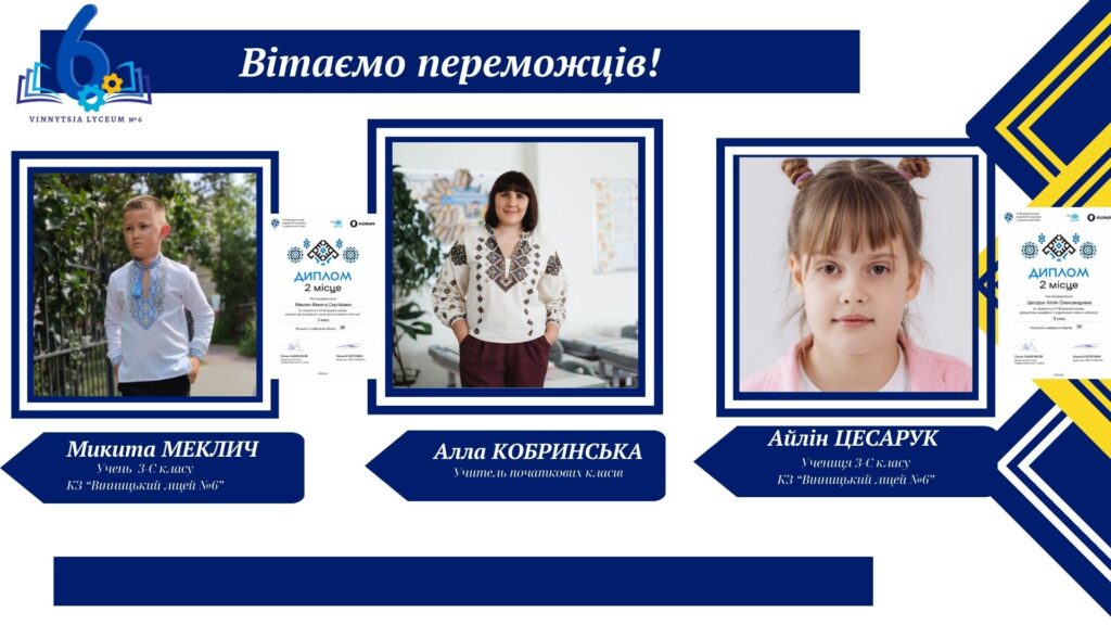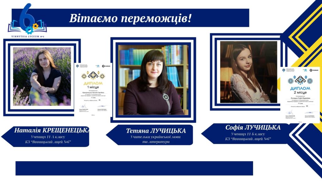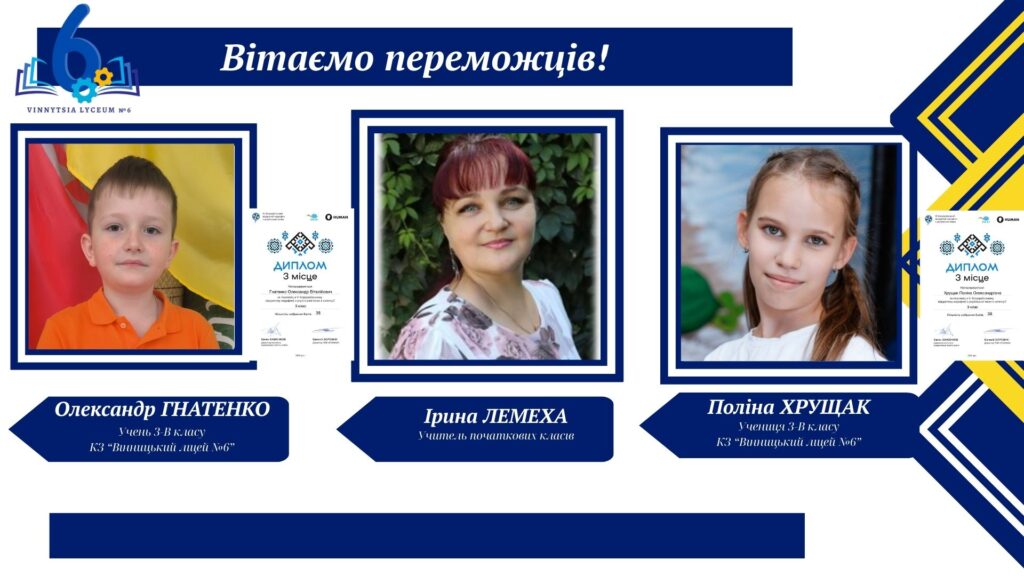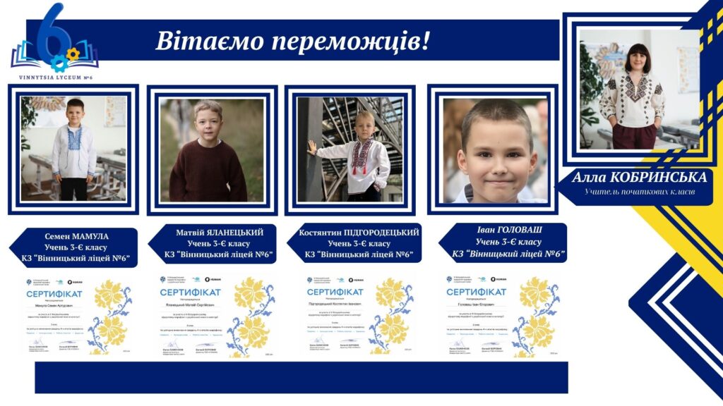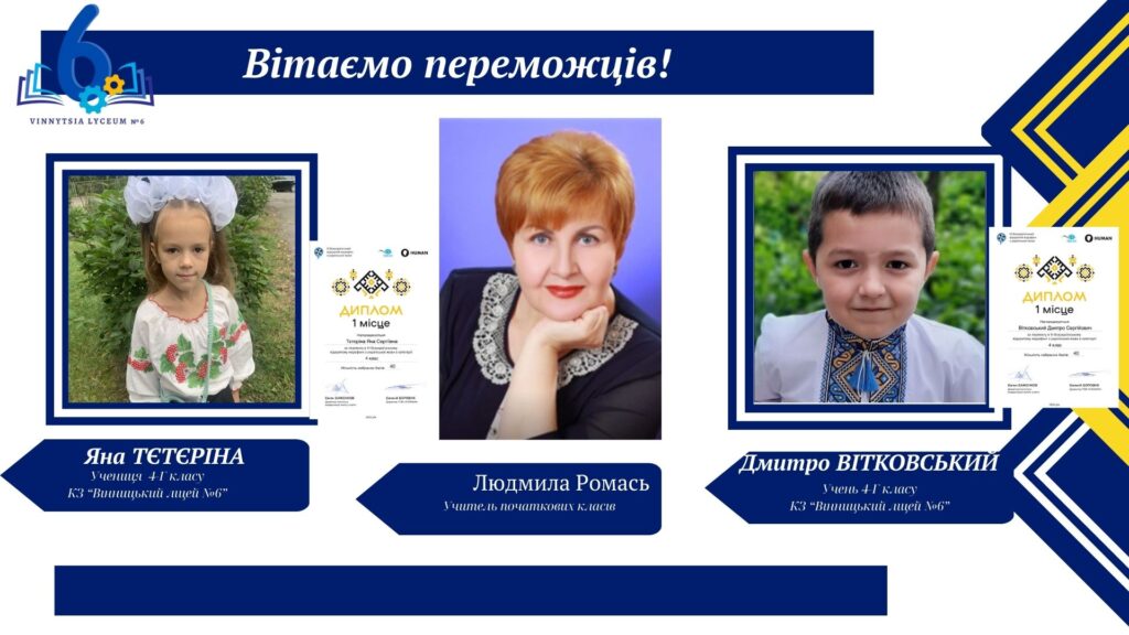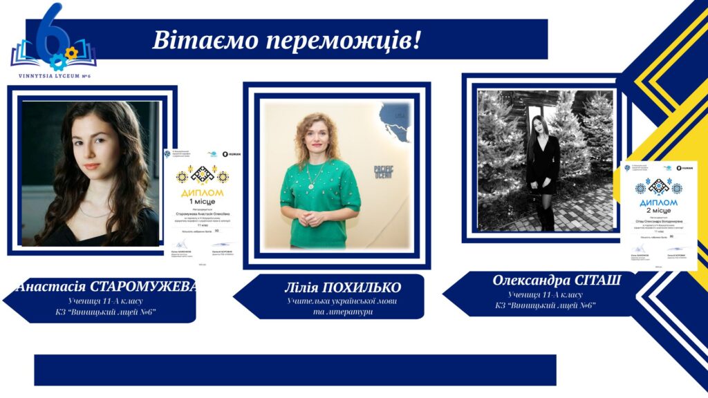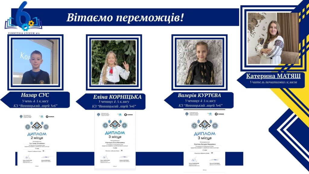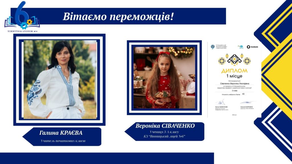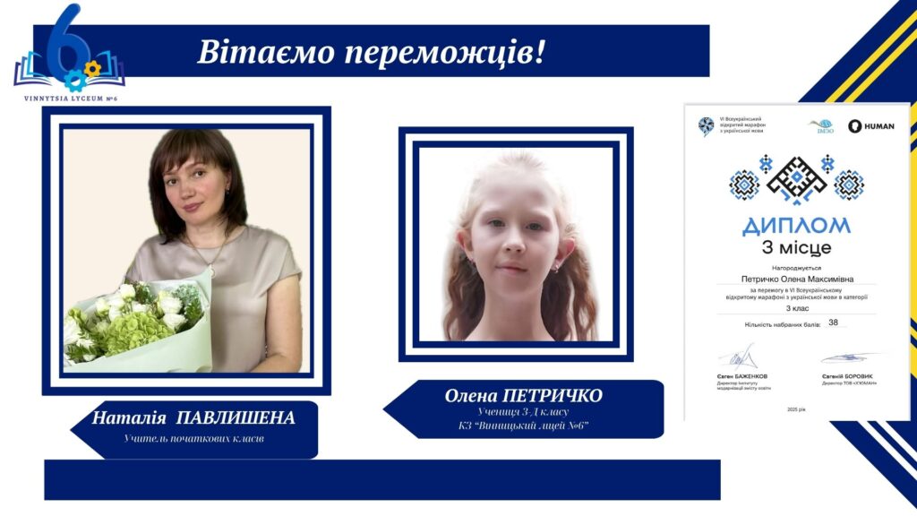 Вітаємо учнів КЗ «Вінницький ліцей №6» із хорошим результатами у VІ Відкритому марафоні з української мови! Цьогоріч Марафон став справді глобальним: понад 16 тисяч учасників зі 191 країни світу випробовували свої знання на платформі «HUMAN».